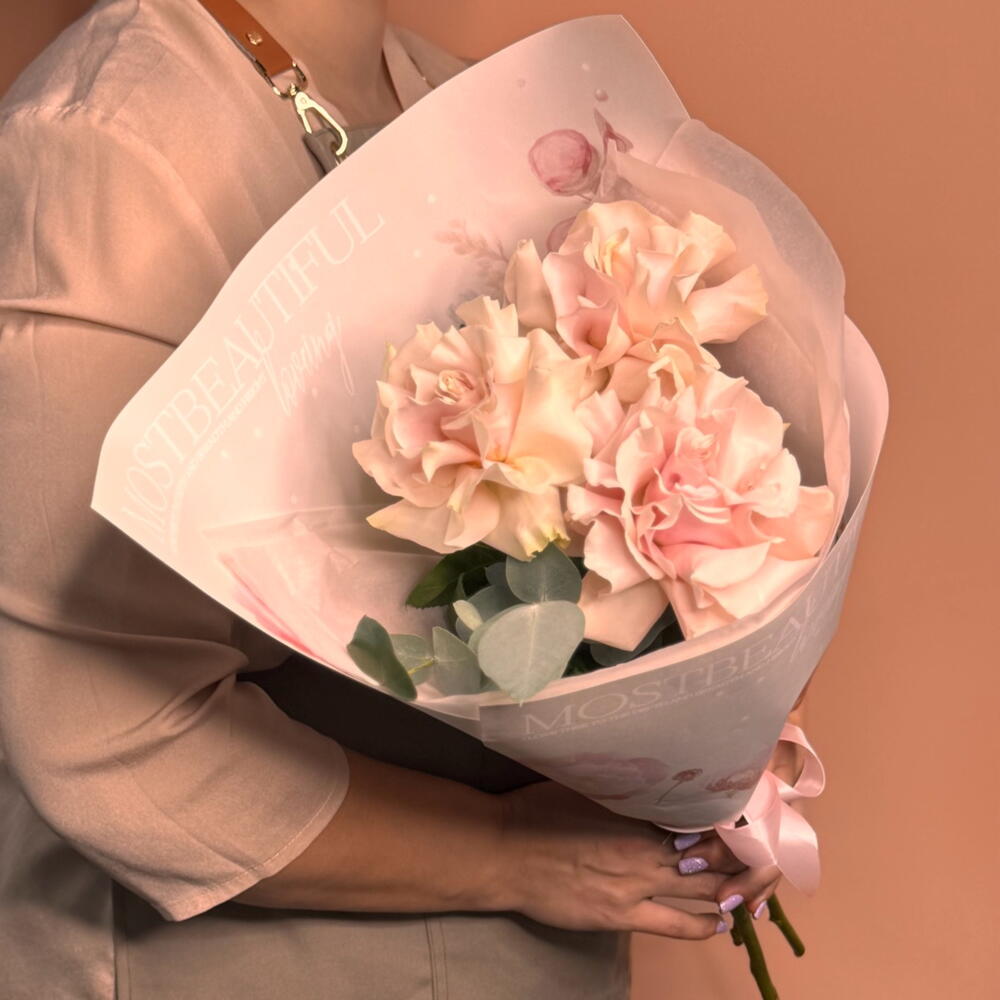 Миниатюрный комплимент, составленный из трёх ароматных французских роз мягкого пастельного оттенка в сопровождении изящной веточки эвкалипта. Это утончённое и лаконичное проявление симпатии, благодарности или желания поднять настроение без громкого повода. Оптимальное решение для небольшого презента девушке, подруге, коллеге или маме, а также для встречи на первом свидании или жеста «без причины».
